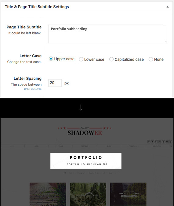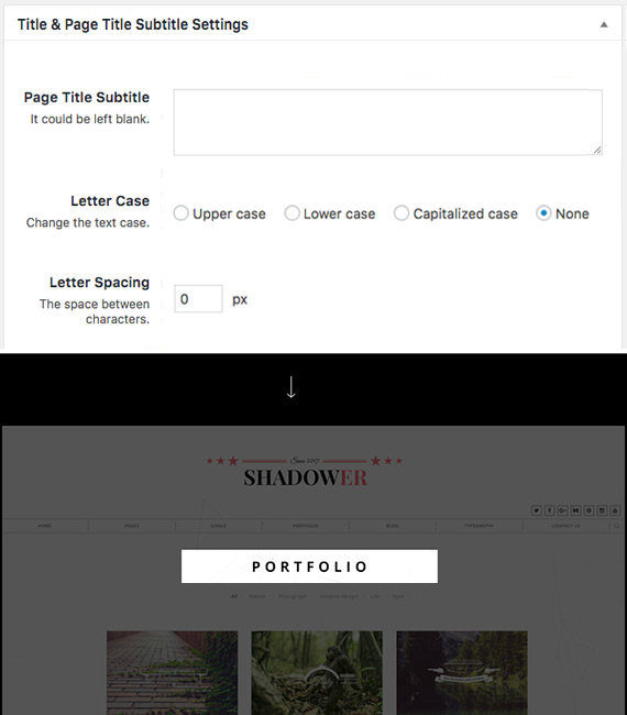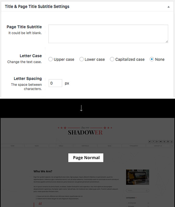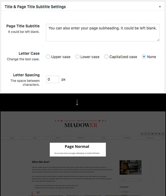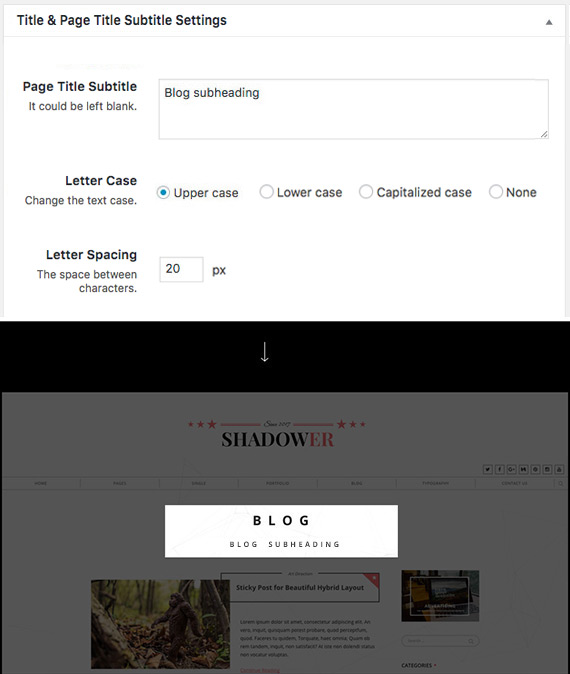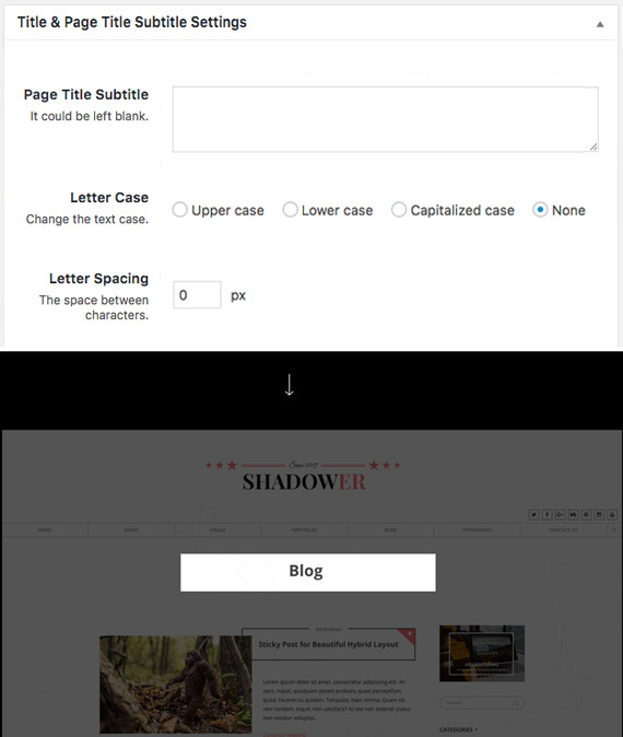 Dashboard » Appearance » Customize » Blog Settings to design of the layout.Dashboard » Appearance » Customize » Blog Settings to design of the layout.Dashboard » Appearance » Customize » Products Settings to design of the layout.To specify the Page Title Subtitle, Letter Case and Letter Spacing. Locate the "Title & Page Title Subtitle Settings" section on the bigger left one.