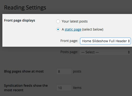 Dashboard » Settings » Reading » Front page displays. Select A Static Page option.