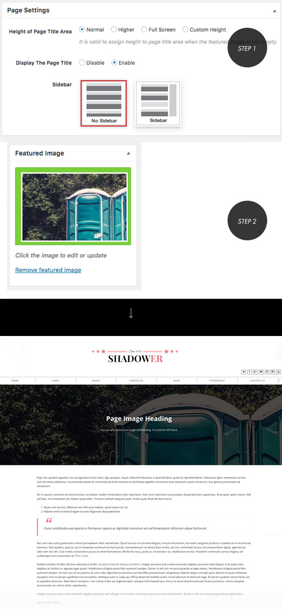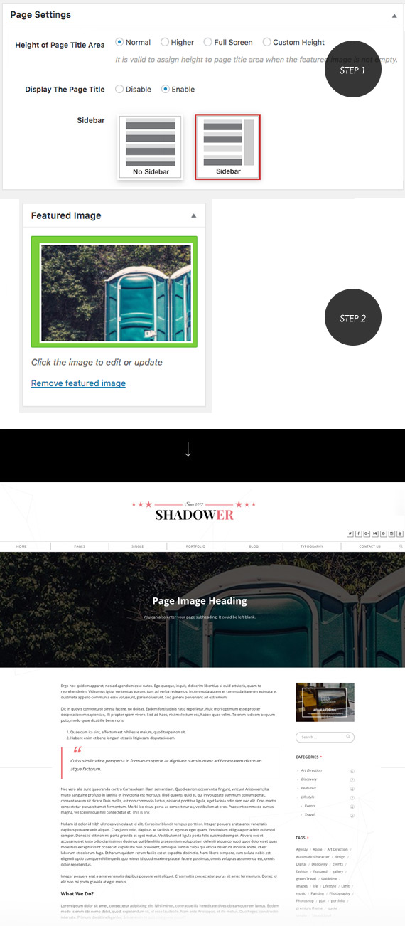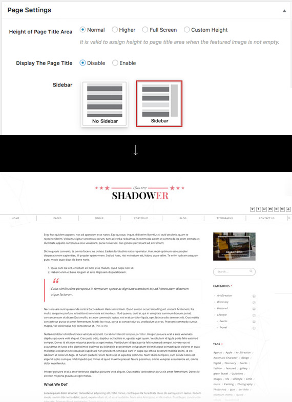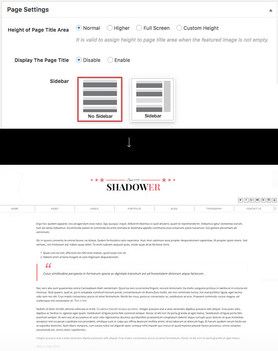 To specify the Height of Page Title Area, Display The Page Title, Sidebar and Featured Image. Locate the "Page Settings" section on the bigger left one.