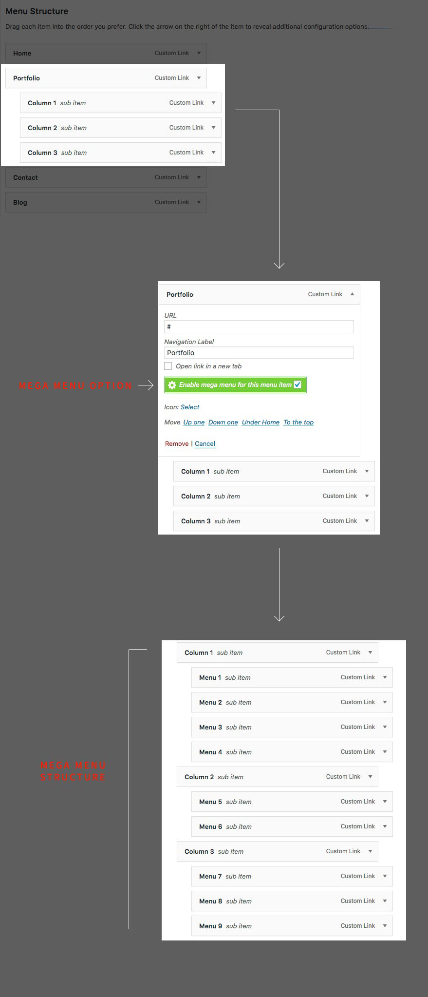 The Mega Menu extension gives the end-user the ability to construct advanced navigation menus. You can create one in the same way you create a regular sub menu. However, you have to choose the option of Enable Mega Menu to activate the mega-menu. The next level of submenu will be mega menu each column's title. Like this: