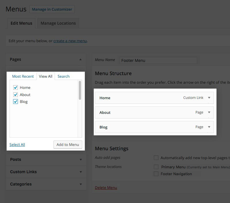 When I create a custom WordPress theme for my clients I like to create a footer menu as well. This is useful for adding links to contact, sitemap and so on. Like this:
