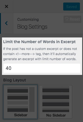 Go to Dashboard » Appearance » Customize » Blog Settings. Locate the "Limit the Number of Words in Excerpt" region and edit it. When you’re done, click "Save & Publish" button.