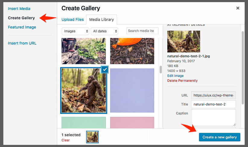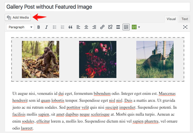 Add Media » Create Gallery and press "Create a new gallery" button in order to insert the gallery into the post.