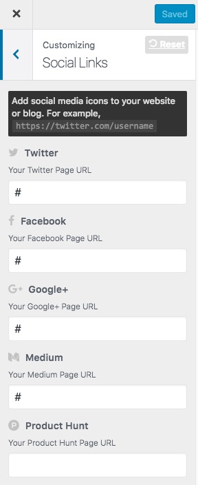 You can add social media icons to Header and Footer. It contains almost all major social icons: Twitter, Facebook, Google+, Medium, Product Hunt, Last.fm, SoundCloud, Dropbox, Dribbble, Pinterest, Behance, Deviantart, Flickr, Github, Instagram, Linkedin, Digg, Tumblr, Youtube, Vimeo, Reddit, Stack Overflow, WordPress, Codepen, Amazon, 500px, Vk, Weibo.