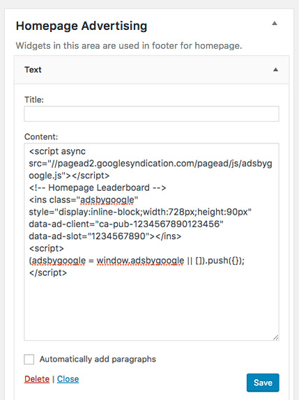 Widgets in this area are used in footer for your home page. You can add the Ads in your sidebar by using WordPress widgets. Simply go to Appearance » Widgets in your WordPress admin area. Next drag & drop the Text widget to the appropriate widget area and paste your Google AdSense code in there.